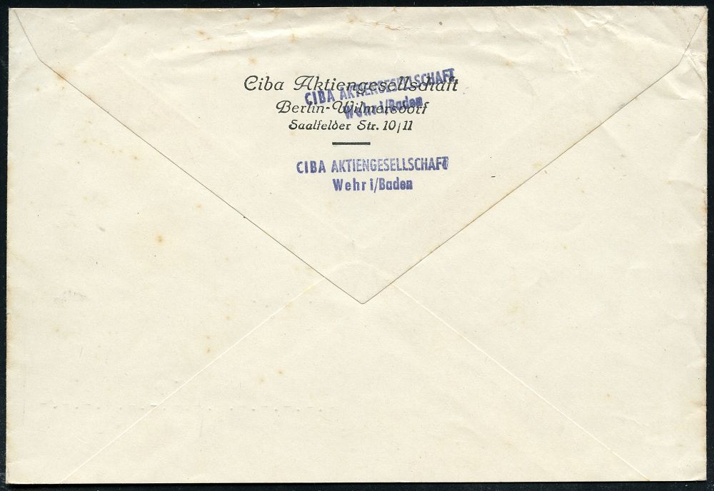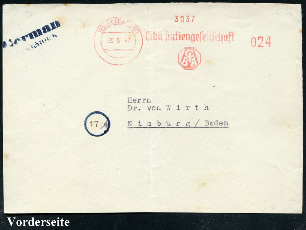 5831 | 16 € | POSTLEITRAUM 7800 (OHNE FREIBURG) : WEHR (BADEN)/ Ciba Aktiengesellschaft.. 1947 (29.5.) aptierter AFS Francotyp ohne Wertrahmen, aber m i t Abs.-Klischee = Notmaßnahme! (Firmen-Logo), Firmen-Vorderseite (Dü.E-16-242h) | ![]() | |