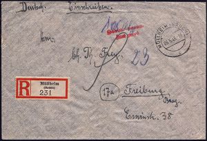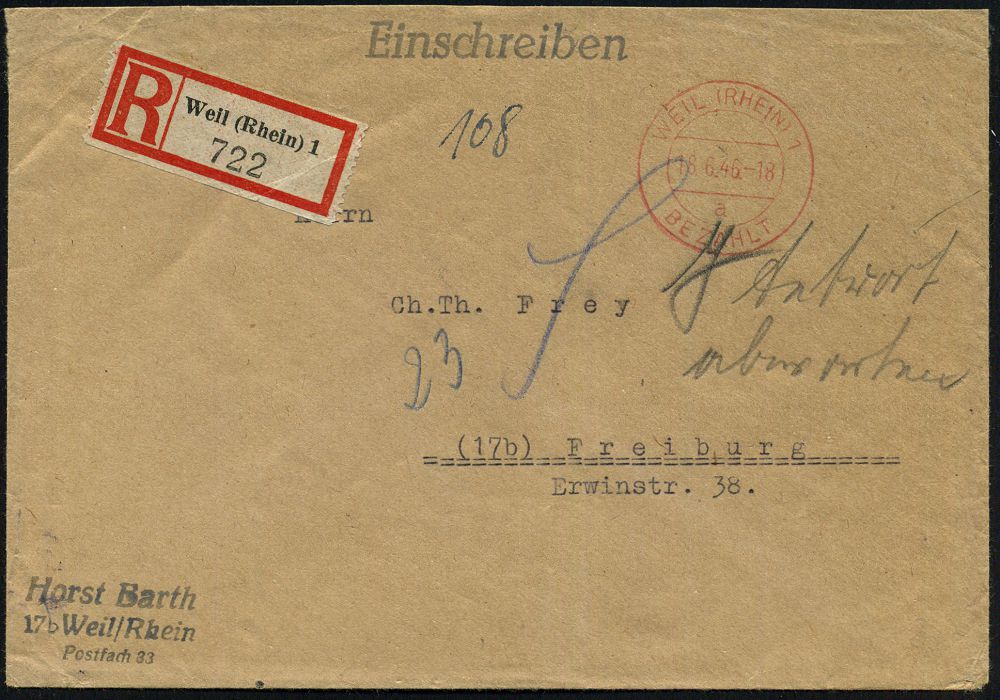 5742 | 16 € | POSTLEITRAUM 7800 (OHNE FREIBURG) : MÜLLHEIM (BADEN)/ c 1946 (6.5.) 2K-Steg + roter 2L: Gebühr bezahlt/Port payé + RZ: Müllheim/(Baden) , Inl.-R-Bf. n. Freiburg/Br. (Nr.5201) | ![]() | |