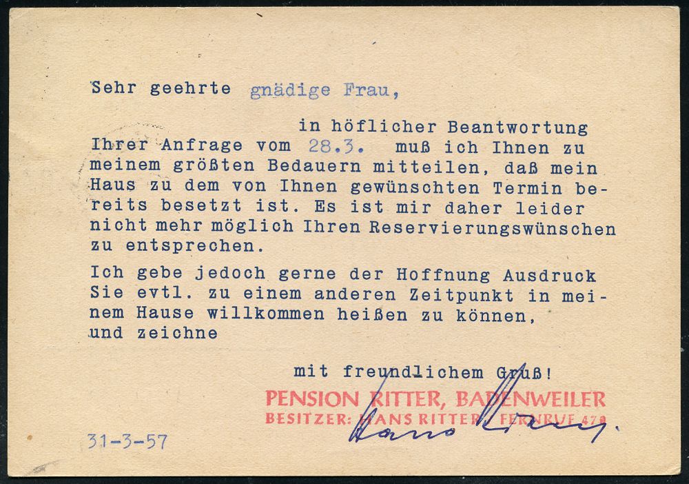 5659 | 15 € | POSTLEITRAUM 7800 (OHNE FREIBURG) : BADENWEILER/ ..Die alte römische Therme 1957 (31.3.) HWSt (liegender Römer) = Aesculap auf Heuss-Frankatur, klar gest. Reklame-Kt.: Pension Ritter.., rs. roter Abs.-HdN. (Bo.4) | ![]() ![]() | |