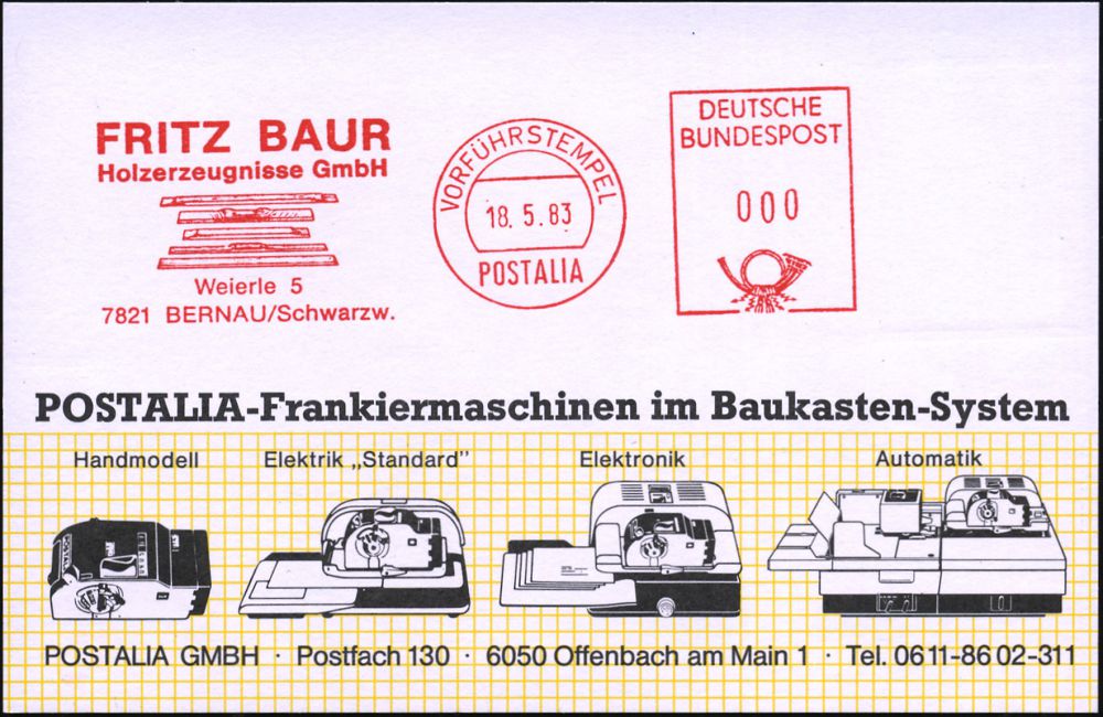 5664 | 18 € | POSTLEITRAUM 7800 (OHNE FREIBURG) : 7821 Bernau 1983 (18.5.) AFS.: VORFÜHRSTEMPEL/POSTALIA/FRITZ BAUR/Holzerzeugnisse.. (div. Bretter u. Latten) seltene Postalia-Musterkt.! (= Specimen) | ![]() | |