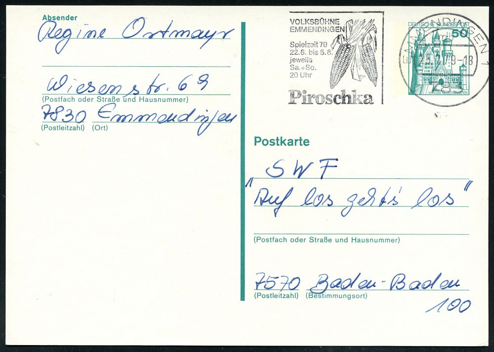 5676 | 6 € | POSTLEITRAUM 7800 (OHNE FREIBURG) : 783 EMMENDINGEN 1/ mb/ VOLKSBÜHNE../ Piroschka 1979 (25.7.) MWSt (Maiskolben) Bedarfs-Kt., = Theaterstück von Hugo Hartung (1954), auch verfilmt! | ![]() | |