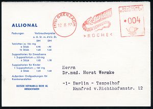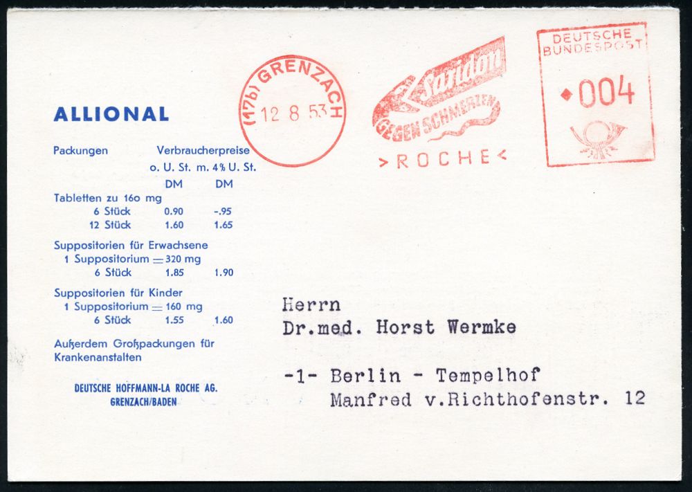 5683 | 16 € | POSTLEITRAUM 7800 (OHNE FREIBURG) : (17b) GRENZACH/ Saridon/ GEGEN SCHMERZEN/ >ROCHE< 1953 (12.8.) AFS Francotyp "Posthorn" = Schlange auf (halber) Reklame-Kt.: ALLIONAL GEGEN Schmerzen u. Schlaflosigkei n. West-Berlin (Dü.E-23DO) | ![]() ![]() | |
