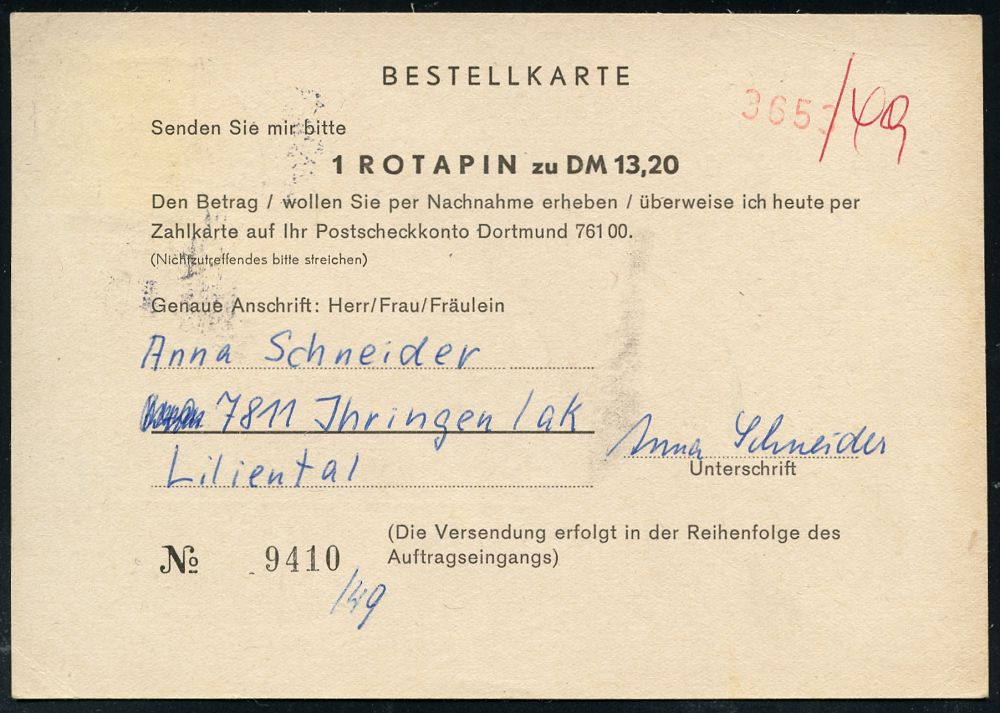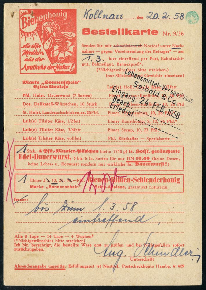 5691 | 14 € | POSTLEITRAUM 7800 (OHNE FREIBURG) : (17b) GUTACH (BREISGAU)/ NÄHSEIDE 1958 (20.2.) HWSt (Garnrolle) klar auf unfrankierter Werbeantwort-Bestellt. für Bienenhonig (daher n u r 10 Pf. Nachporto!) n. Nortorf (Bo.4) | ![]() ![]() | |