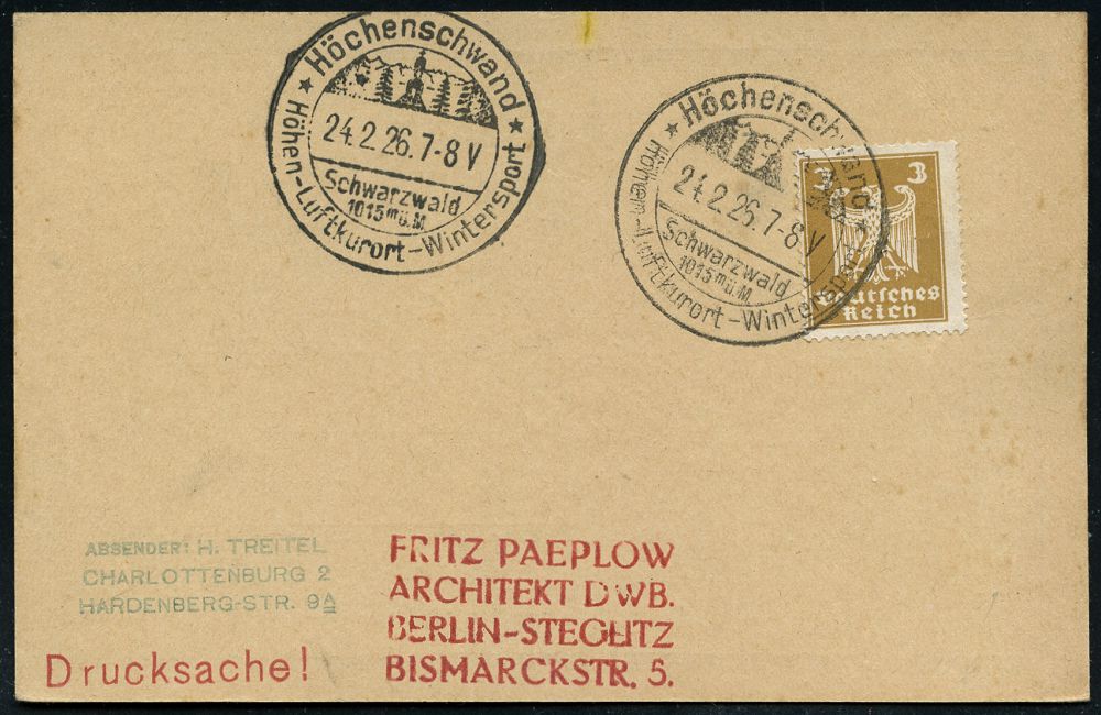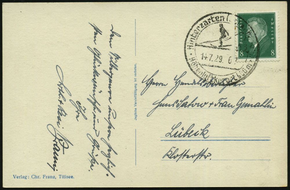 5702 | 15 € | POSTLEITRAUM 7800 (OHNE FREIBURG) : Hinterzarten (Schwarzwald)/ Höhenluftkurort.. 1925 (25.5.) HWSt = Skiläufer , 2x klar auf Inl.-Karte (Bo.1, Erstjahr) | ![]() | |
