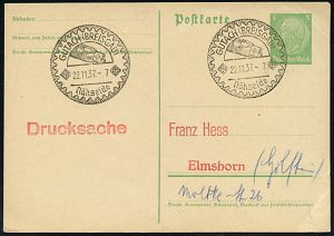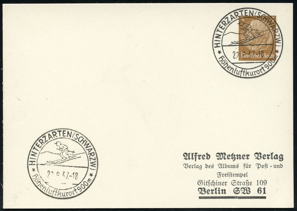 5707 | 18 € | POSTLEITRAUM 7800 (OHNE FREIBURG) : HINTERZARTEN(SCHWARZW)/ Höhenluftkurort 900m 1937 (23.7.) HWSt = Ski-Abfahrtsläufer auf PP 3 Pf. Hindenbg., braun: Alfred Metzner Verlag, Berlin (Mi.PP 122/B 9) klar gest. Inl.-Kt. (Bo.2 , Erstjahr I.Verwendung nur 1937-39) | ![]() | |