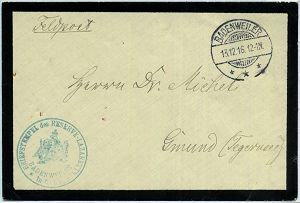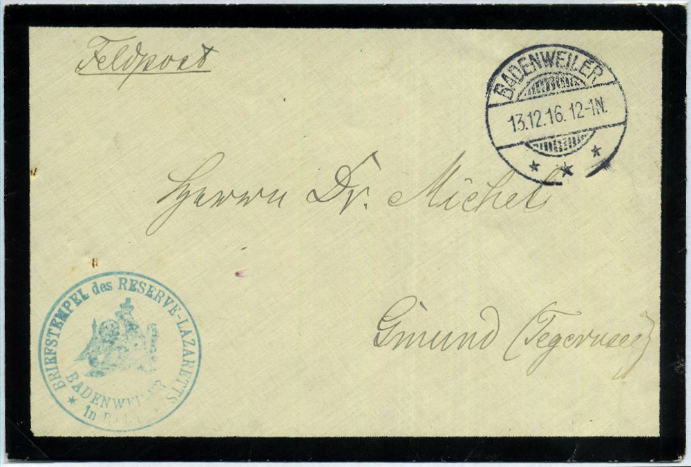5651 | 18 € | POSTLEITRAUM 7800 (OHNE FREIBURG) : BADENWEILER/ *** 1916 (13.12.) 1K-Gitter + grüner HdN: ..RESERVE-LAZARETT/BADENWEILER (preuß. Adler) auf Feldpost-Trauer-Bf.! | ![]() | |