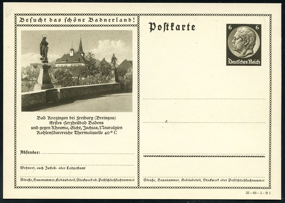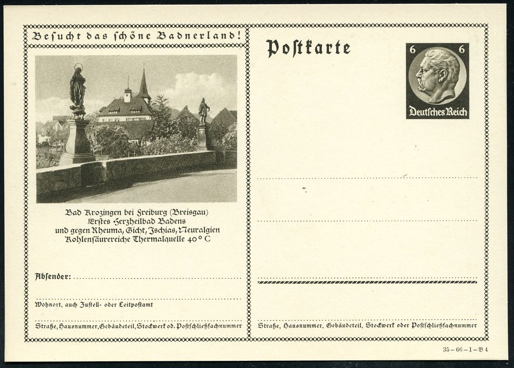 5661 | 18 € | POSTLEITRAUM 7800 (OHNE FREIBURG) : Bad Krozingen 1935 6 Pf. BiP Hindenbg., braun: Erstes Herzheilbad.. gegen Rheuma.. Thermalquelle40° C., Sonderform "Besucht das schöne Badnerland!" (Kirche, Brücken-Heilie) Bild 1 und B 4, je ungebr. (Einzelverkauf möglich: je 10.- EUR), 2 Belege (Mi.P 236//36-66-1-B 1, B 4) | ![]() ![]() | |