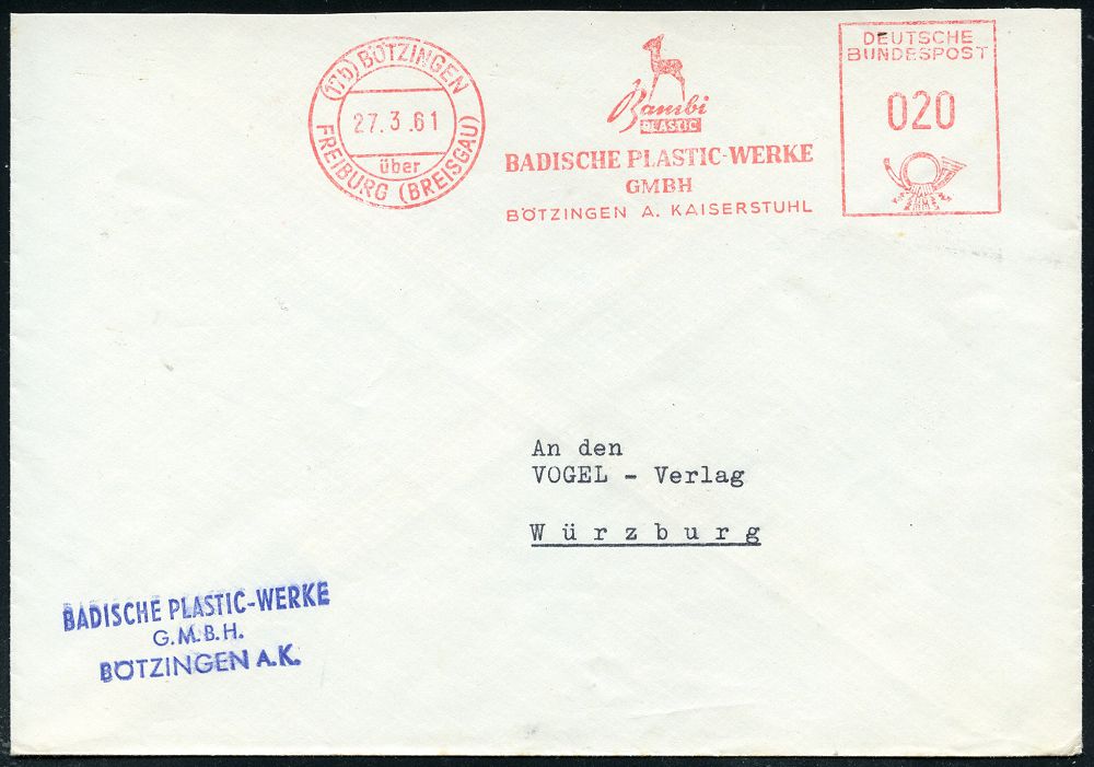 5666 | 15 € | POSTLEITRAUM 7800 (OHNE FREIBURG) : (17b) BÖTZINGEN/ über/ Freiburg (BREISGAU)/ Bambi../ BADISCHE PLASTIC-WERKE.. 1961 (27.3.) AFS Francotyp = PSt.I-Typ (kl. Reh) + Abs.-3L, Fern-Bf. (Dü.E-23CO) | ![]() | |