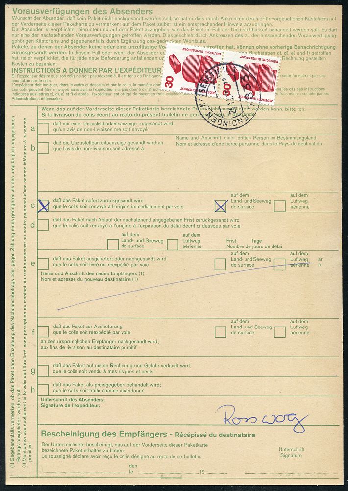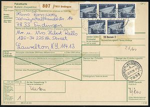 5678 | 18 € | POSTLEITRAUM 7800 (OHNE FREIBURG) : 7833 ENDINGEN,KAISERSTUHL 1/ a 1976 (26.11.) 1K-Segment mehrfach auf 5x 500 Pf. Radioteleskop (wie MeF) u.a. rs. (2x 30 Ufall) + brauner Paketzettel: 7833 Endingen, sauber gest. Übersee-Paket-Kt. n. USA, Porto = 2560 Pf.! (Mi.5x 859 u.a. rs.) | ![]() ![]() | |