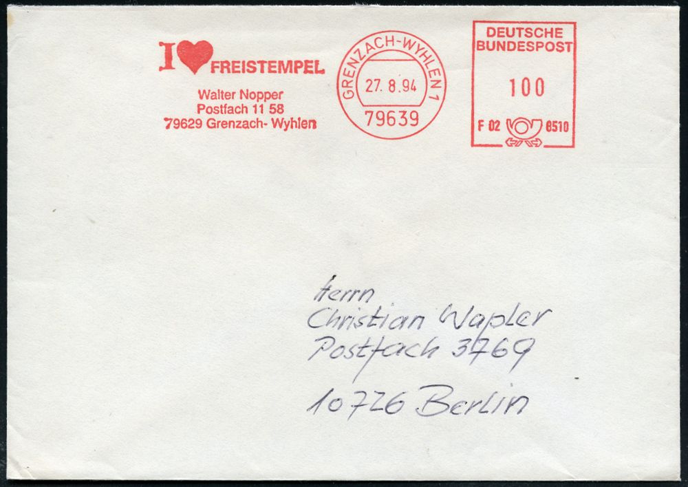 5685 | 5 € | POSTLEITRAUM 7800 (OHNE FREIBURG) : 79639 GRENZACH-WYHLEN 1/ I (love) FREISTEMPEL/ Walter Nopper.. 1994 (27.8.) AFS Francotyp "stils. Posthorn" mit Kennung (Herz) Fern-Bf. | ![]() | |