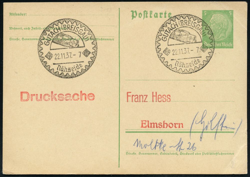 5689 | 16 € | POSTLEITRAUM 7800 (OHNE FREIBURG) : GUTACH (BREISGAU)/ Nähseide 1937 (22.11.) HWSt = Nähseidenrolle (u. Firmen-Logo der Fa.Gütermann & Co., klar gest. Inl.-Karte, vergl. Kat.-Nr.5686-88, 5690 (Bo.3, nur 1937-38 im III.Reich verwendet) | ![]() | |