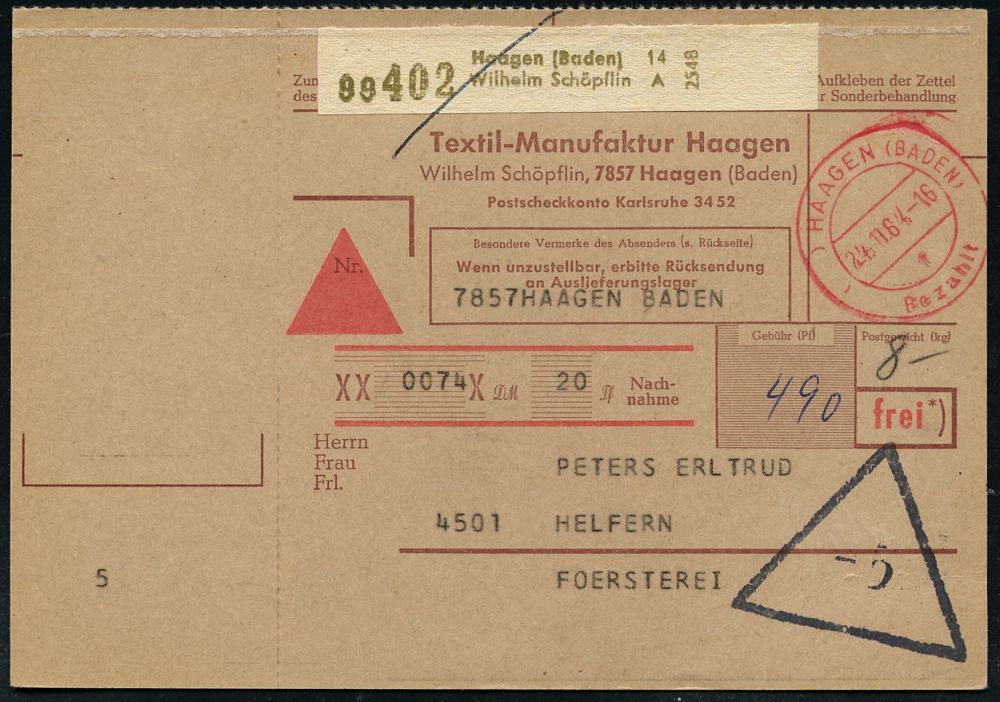 5693 | 18 € | POSTLEITRAUM 7800 (OHNE FREIBURG) : ( ) HAAGEN (BADEN)/ f/ Bezahlt 1964 (26.11.) aptierter 2K-Paket-PFS = alte PLGZ entfernt, 2 Klammern übrig + brauner Selbstbucher-Paketzettel ohne PLZ: Haagen (Baden) 14/ Wilhelm Schöpflin A, seltene Inl.-NN-Selbstbucher-Paketkt. (Dü.34 aptiert , Dürst unbekannt!) | ![]() | |