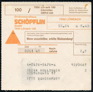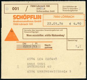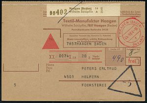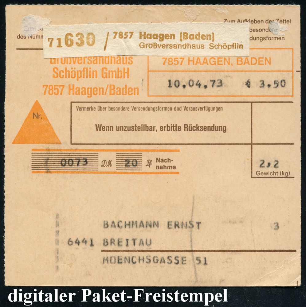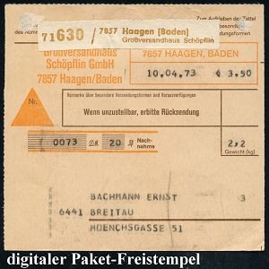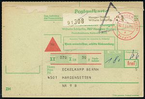 5694 | 16 € | POSTLEITRAUM 7800 (OHNE FREIBURG) : 7857 HAAGEN, BADEN 1973 (10.04.) diigitaler Paket-FS mit kl. Posthorn vertikal 3,50 (DM) in orangem Feld + brauner Selbstbucher-Paketzettel: 7857 Haagen (Baden)/ Großversandhaus Schöpflin , Inl.-NN-Selbstbucher-Paket-Kt. n. 6441 Breitnau, rs. AS + Gebühr 120 Pf. Heinemann = Postautomation (Dü.J-2, Nr.3) | ![]() ![]() | |