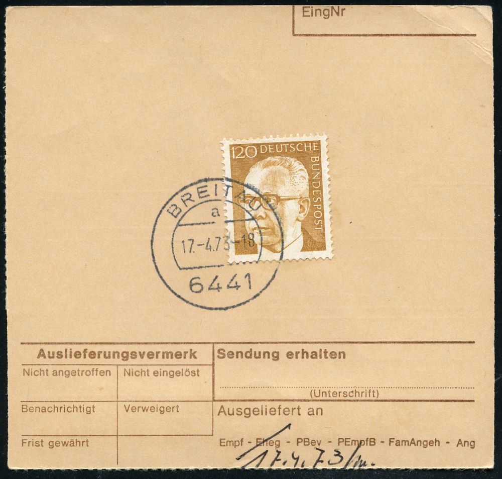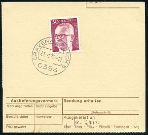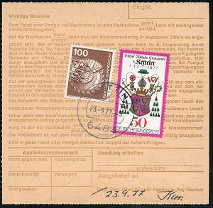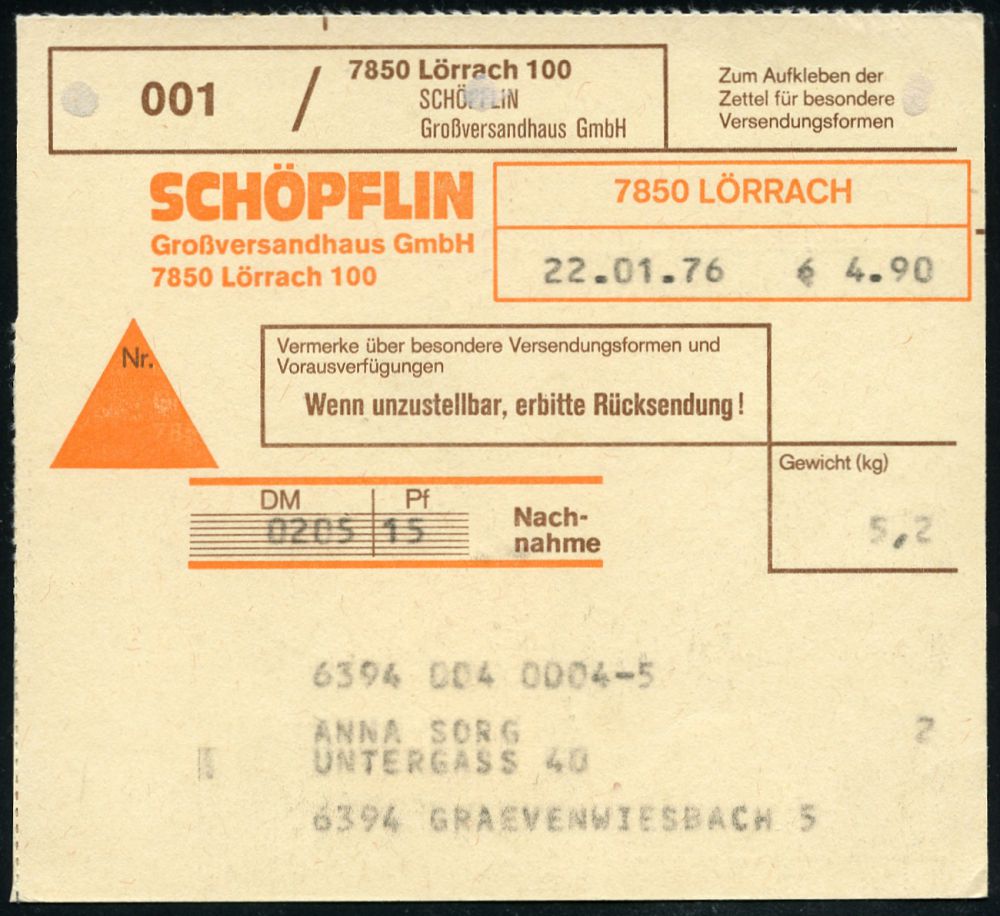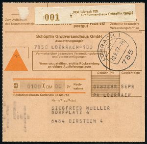 5732 | 16 € | POSTLEITRAUM 7800 (OHNE FREIBURG) : 7850 LÖRRACH/ SCHÖPFLIN/ Großversandhaus.. 1976 (22.1.) digitaler Paket-FS mit vertikalem Posthorn, 4,90 (DM) mit Tag u. Monatsangabe , Selbstbucher-NN-Paket-Kt.: 7850 LÖRRACH 100.. n. 6394 Gravenwiebbach 5, rs. Eingangsgebühr 150 Pf. Heinemann (Mi.730 EF + 15.- EUR), = EDV-Freimachung = Postautomation (Dü.J-2, Nr.3) | ![]() ![]() | |