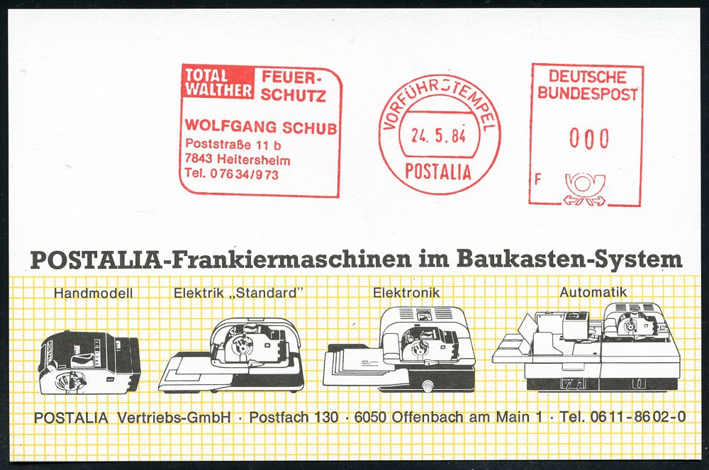5700 | 16 € | POSTLEITRAUM 7800 (OHNE FREIBURG) : 7843 Heitersheim 1984 (24.5.) AFS.: VORFÜHSTEMPEL/ POSTALIA/F/TOTAL/WALTHER/FEUER-/SCHUTZ/ WOLFGANG SCHUB.. , seltene Postalia-Muster-Kt. (= Specimen) | ![]() | |