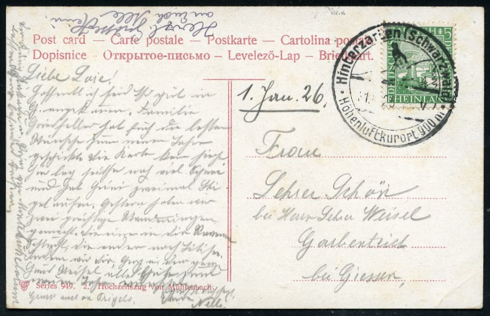 5703 | 18 € | POSTLEITRAUM 7800 (OHNE FREIBURG) : Hinterzarten (Schwarzwald)/ Höhenluftkurort.. 1925 (31.12.) HWSt = Skiläuferauf Color-Ak.: Hochzeitszug von Mühlenbach (Serie 949) Bedarfs-Inl.-Karte (Bo.1, Erstjahr) | ![]() ![]() | |