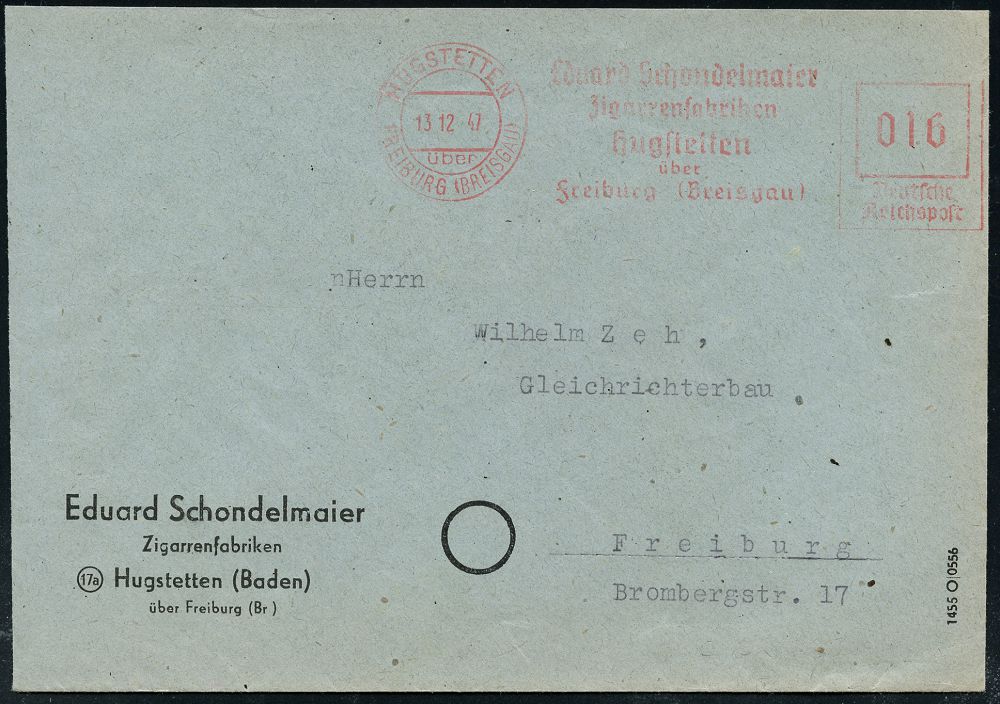 5709 | 25 € | POSTLEITRAUM 7800 (OHNE FREIBURG) : HUGSTETTEN/ über/ Freiburg 8breisgau)/ Eduard Schondelmaier/ Zigarrenfabrien.. 1947 (13.12.) aptierter AFS Francotyp "Reichsadler" = entfernt = Notmaßnahme! (wie oft zeitbedingt etw. hell) Firmen-Bf.: Eduard Schondelmaier.. n. Freiburg/Br. (Dü.E-13 R-129o = seltene Type!) | ![]() | |