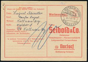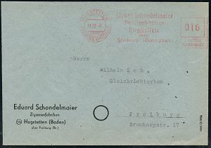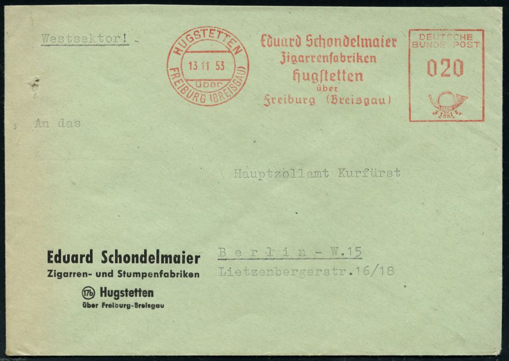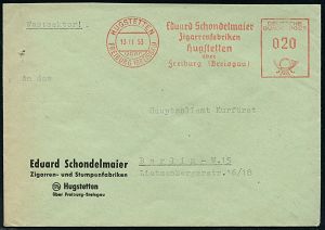 5710 | 15 € | POSTLEITRAUM 7800 (OHNE FREIBURG) : HUGSTETTEN/ über/ FREIBURG (BREISGAU)/ Eduard Schondelmaier/ Zigarrenfabriken.. 1953 (13.11.) AFS Francotyp "Posthorn" = PSt.I-Typ , notopferbefreiter Firme-Bf. (kl. Kerbe) n. West-Berlin (Dü.E-23CO) | ![]() | |