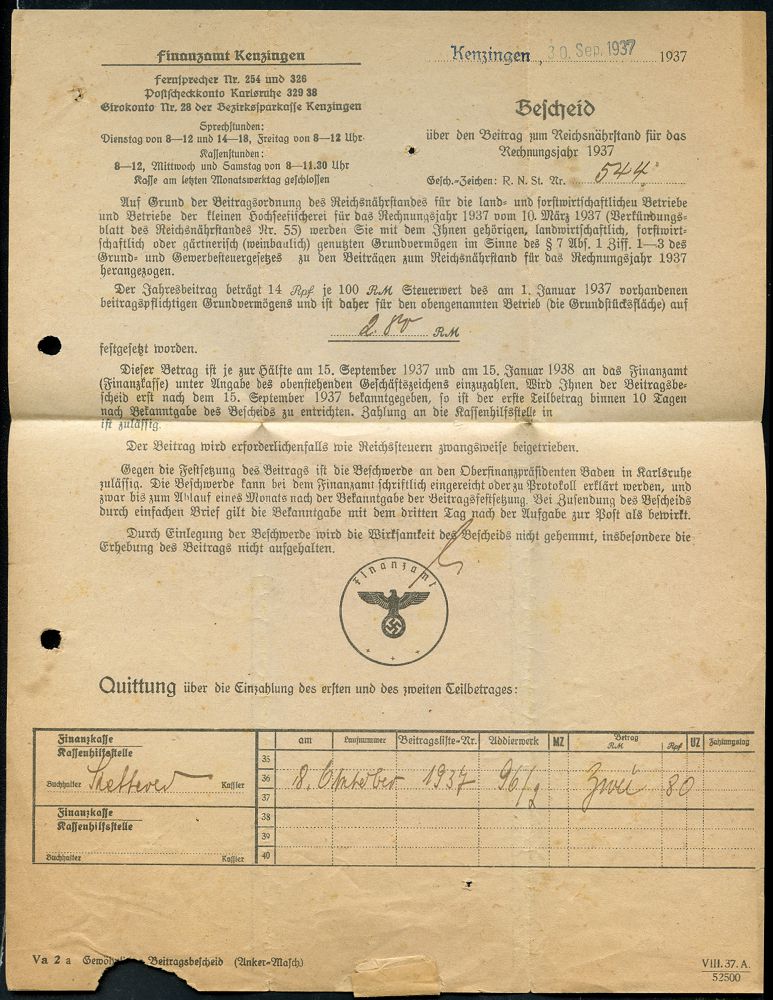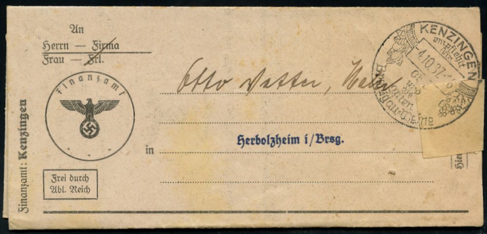 5715 | 12 € | POSTLEITRAUM 7800 (OHNE FREIBURG) : KENZINGEN/ empfiehlt/ sein/ Obst/ und/ die/ guten/ Breisgau-Weine 1937 (4.10.) HWSt (Pflaumen, Weintraube) auf Dienst-Falrt-Bf.: Finanzamt / FdAR mit Inhalt: Bescheid für Reichsnährstand-Gebühren (rechts Öffnungsriß, innen gelocht) n. Herbolzheim (Bo.1) | ![]() ![]() | |