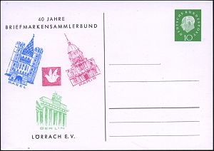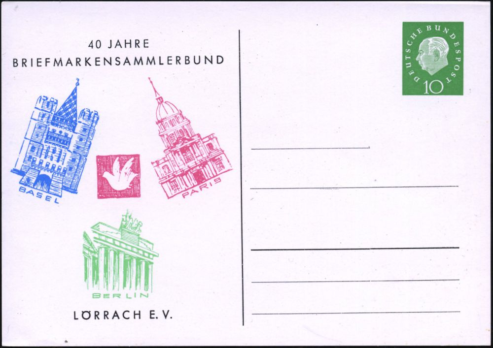 5731 | 16 € | POSTLEITRAUM 7800 (OHNE FREIBURG) : Lörrach 1961 (Mai) PP 10 Pf. Heuss III, grün: 40 JAHRE BRIEFM.SAMMLERBUND = Invalidendom Paris = Grablege Napoleons! (+ Brandenbg.Tor u. Spalentor, Basel U: Friedenstaube) ungebr. (Mi.PP 18/17) | ![]() | |