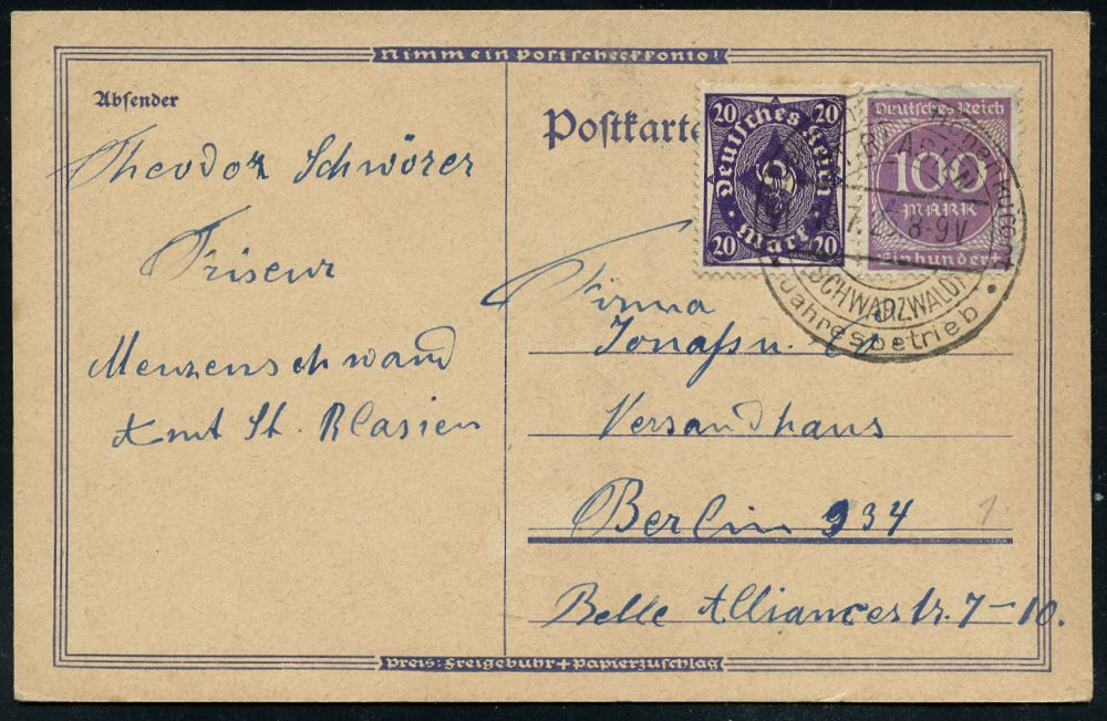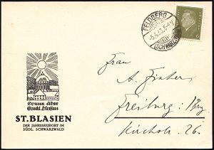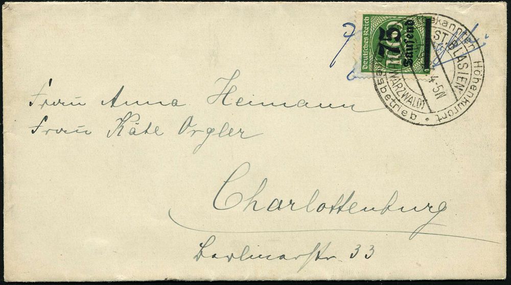 5773 | 30 € | POSTLEITRAUM 7800 (OHNE FREIBURG) : ST.BLASIEN/ (SCHWARZWALD)/ Bekannter Höhenkurort/ Jahresbetrieb 1923 (4.9.) HWSt auf EF 75 T./1000 Mk. , klar gest. Infla-Fern-Bf. n. Berlin (Bo.1) | ![]() | |
