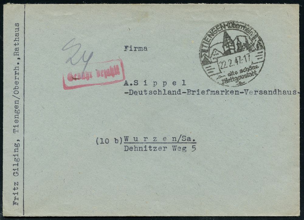 5797 | 12 € | POSTLEITRAUM 7800 (OHNE FREIBURG) : TIENGEN (Oberrhein)/ alte schöne/ Klettgaustadt 1947 (22.2.) HWSt (Ortsbilr) + roter Ra.: Gebühr bezahlt, Fernbf. in die SBZ (Bo.2) | ![]() | |