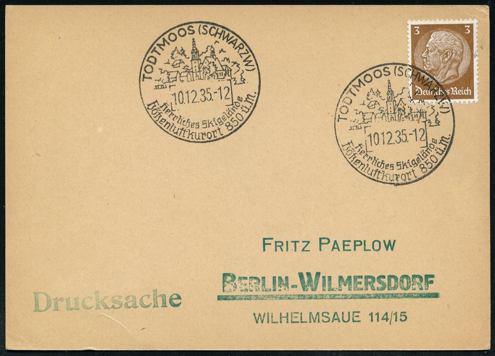 5803 | 12 € | POSTLEITRAUM 7800 (OHNE FREIBURG) : TODTMOOS (SCHWARZW)/ Herrliches Skigelände/ ..850 ü.M. 1935 (10.12.) HWSt (Ort mit Kirche) klar gest. Inl.-Karte (Bo.2 , Erstjahr) | ![]() | |