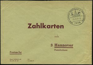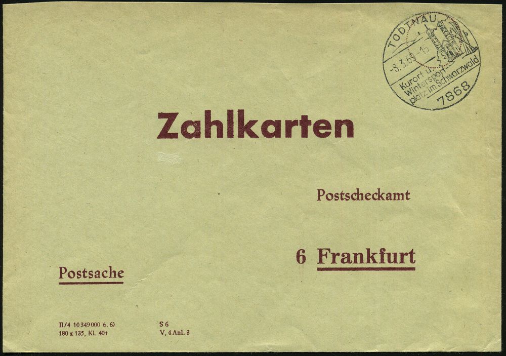 5810 | 14 € | POSTLEITRAUM 7800 (OHNE FREIBURG) : 7868 TODTNAU/ Kurort u./ Wintersport.. 1969 (8.3.) HWSt = Ski, Skistöcke (vor Barockkirche) klar a. PSch-Innendienst-Bf. "Zahlkarten Postscheckamt 6 Frankfurt" (grün/braun für Zahlkarten-Ausstausch, seltene Verwendung! | ![]() | |