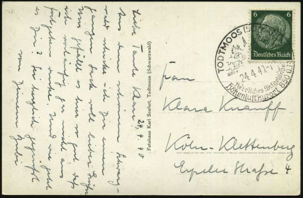 5804 | 16 € | POSTLEITRAUM 7800 (OHNE FREIBURG) : TODTMOOS (SCHWARZ)/ Herrliches Skigelände.. 1940 (24.4.) HWSt (Ort m.Kirche) auf s/w.-Foto-Ak.: Kurheim "Waldfrieden", Bedarf (Bo.2 , Bochmann 1940 unbekannt!) | ![]() ![]() | |