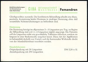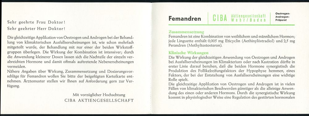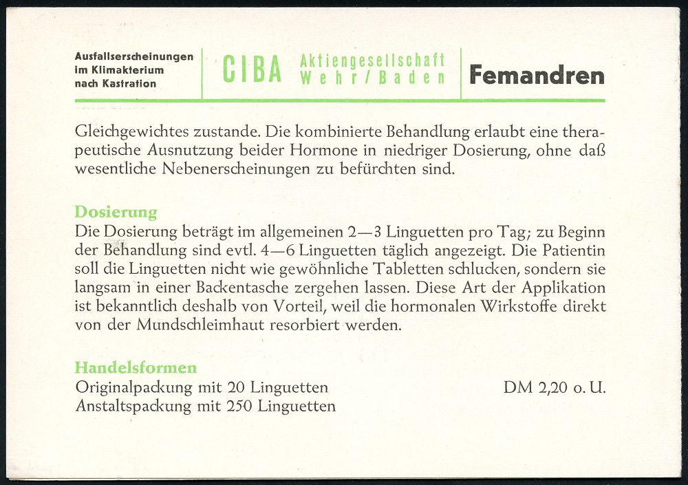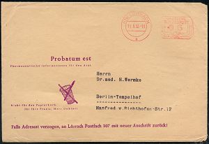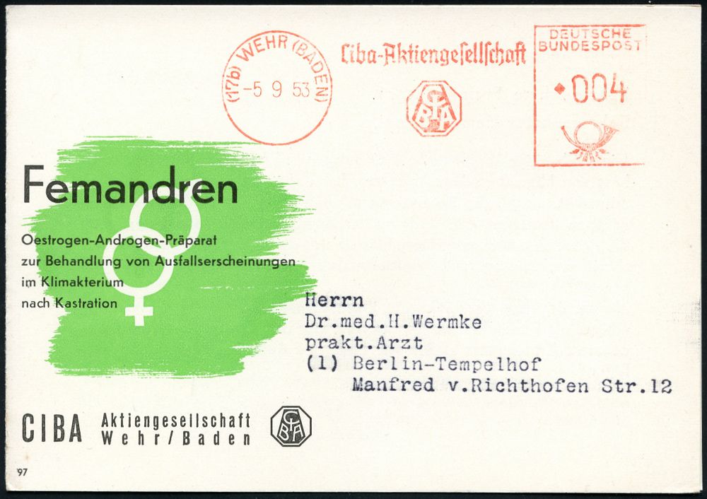 5833 | 18 € | POSTLEITRAUM 7800 (OHNE FREIBURG) : (17a) WEHR (BADEN)/ Ciba AG 1953 (5.9.) AFS Francotyp auf zweifarbiger Reklame-Klapp-Kt.: Femandren.. CIBA AG (Östrogen-Präparat) Fern-Kt. (Dü.E-23DO) | ![]() ![]() ![]() | |