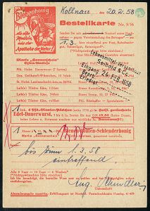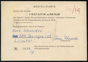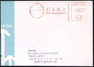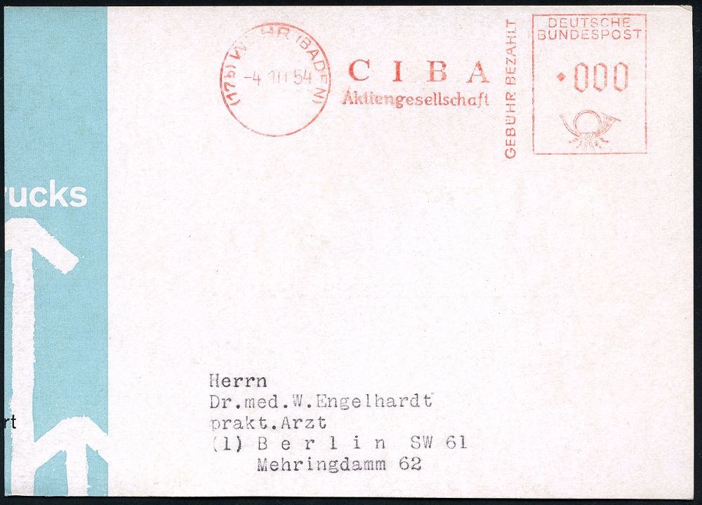5834 | 15 € | POSTLEITRAUM 7800 (OHNE FREIBURG) : (17a) WEHR (BADEN)/ CIBA/ AG/ GEBÜHR BEZAHLT 1954 (4.10.) AFS iFrancotyp in 000 + Gebühr bezahlt = Massen-Drs. auf zweifarbiger (halber) Reklame-Kt.: Gegen Hypertonie Serpasil.. (Dü.E-23DG) | ![]() ![]() | |