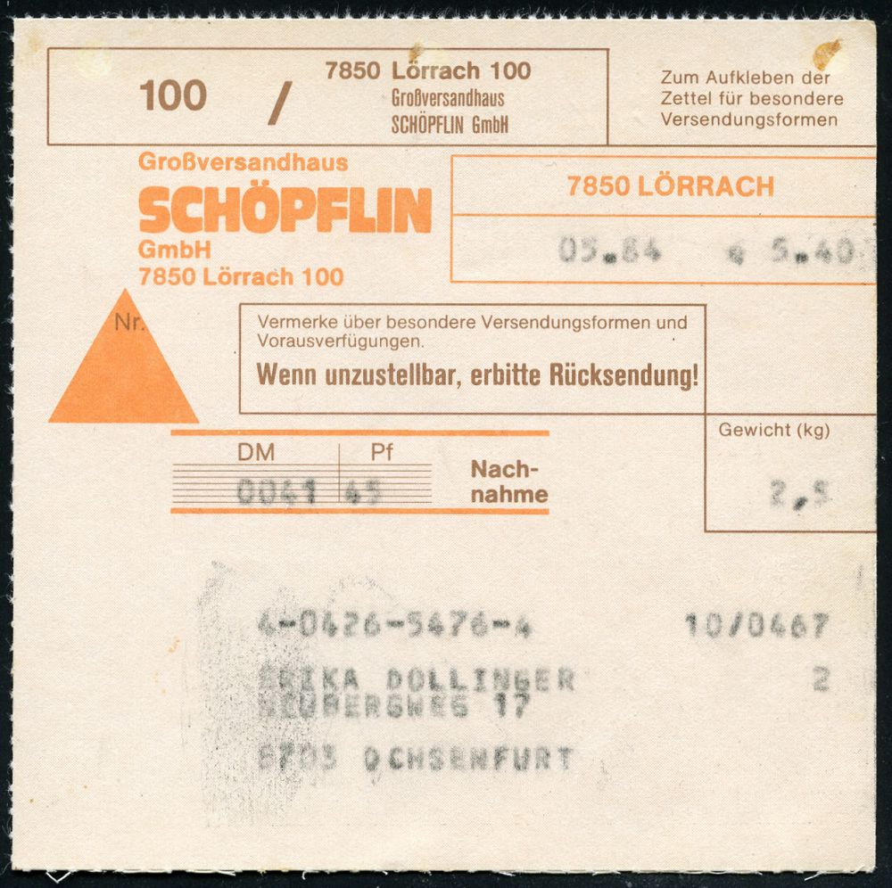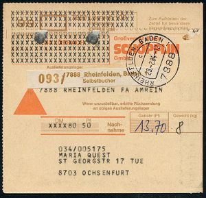 5759 | 8 € | POSTLEITRAUM 7800 (OHNE FREIBURG) : 7888 RHEINFELDEN,BADEN 1c 1984 (29.2.) 1K-Segment + brauner Selbstbucher-Paketzettel: 7888 Rheinfelden, Baden 1/ Selbstbucher , Inl.-NN-Selbstbucher-Paket-Kt.: SCHÖPFLIN GmbH,, (übliche kl. Haftspuren) n. Schweinfurt | ![]() | |