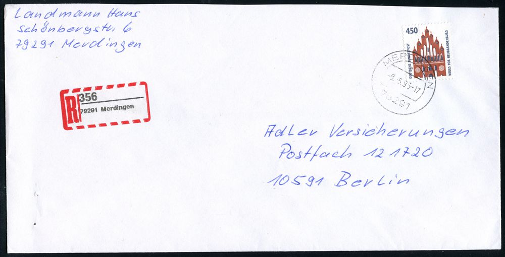 5739 | 12 € | POSTLEITRAUM 7800 (OHNE FREIBURG) : 79291 MERDINGEN/ a 1995 (9.6.) 1K-Segment auf EF 450 Pf. Neubrandenburg + Selbstklebe-RR: 79291 Merdingen , Fern-R-Bf. (Mi.1623 EF + 10.- EUR) | ![]() | |