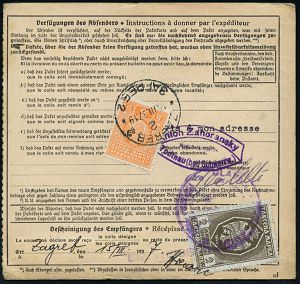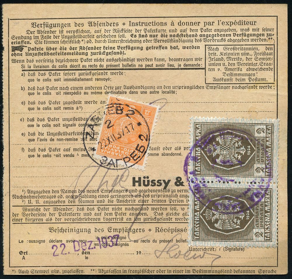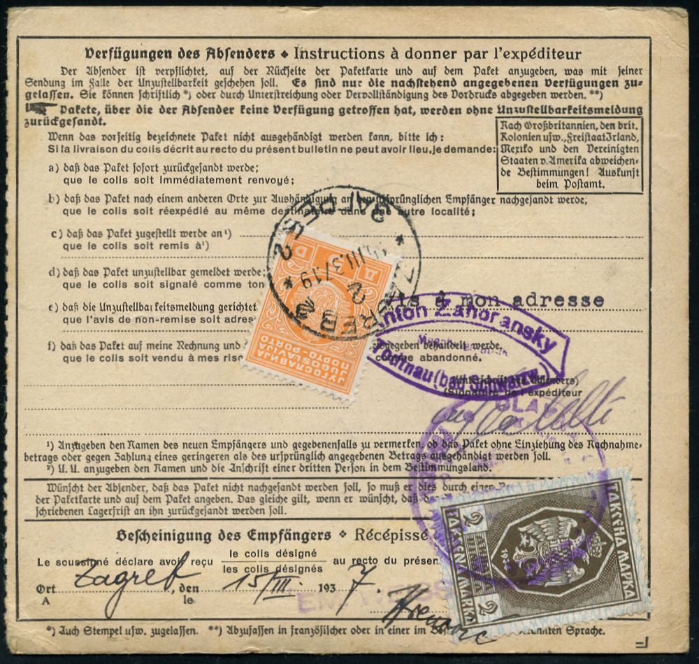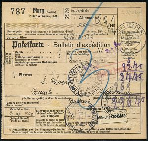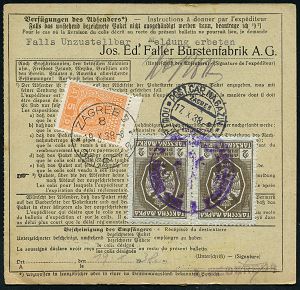 5746 | 25 € | POSTLEITRAUM 7800 (OHNE FREIBURG) : MURG (BADEN)/ a 1937 (14.12.) 2K-Steg + schw. Selbstbucher-Paketzettel: Murg (Baden)/ Hüssy & Künzli, AG + roter Ra.: Gebühr bezahlt + Leitzettel: München (3 Bhf.), Ausl.-Selbstbucher-Paket-Kt. n. Zagreb, rs. jugoslaw. Tax- u. Fiskalmarken | ![]() ![]() | |