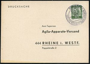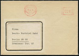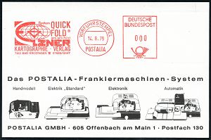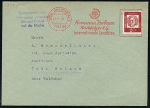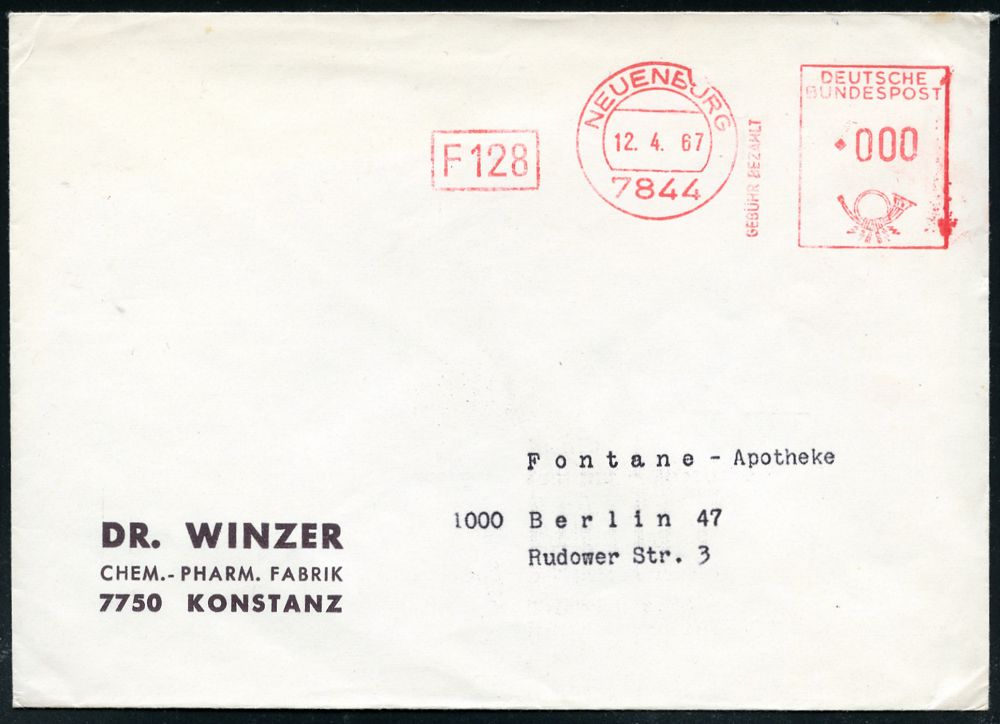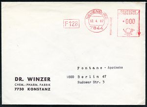 5748 | 15 € | POSTLEITRAUM 7800 (OHNE FREIBURG) : 7844 NEUENBURG/ GEBÜHR BEZAHLT/ F 1 2 8 1967 (12.4.) AFS Francotyp mit Nummernklischee in 000 = Massen-Drs. + GEBÜHR BEZAHLT (Ortsstempel beschädigt) = Probe-Freistempel, nur vier Wochen zulässig, sogen. "Interims-Freistempel" Firmen-Bf.: DR. WINZER, CHEM. FABRIK; 7750 KONSTANZ (Dü.E-26 Interims-Freistempel) | ![]() | |
