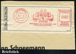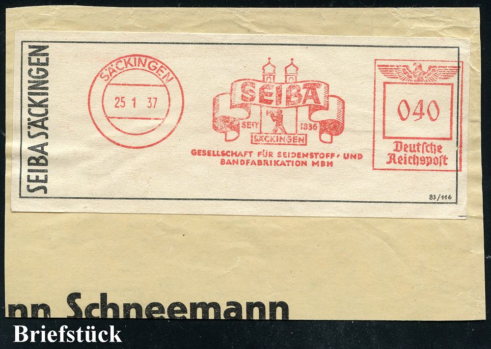 5765 | 14 € | POSTLEITRAUM 7800 (OHNE FREIBURG) : SÄCKINGEN/ SEIBA/ ..GESELLSCHAFT FÜR SEIDENSTOFF- U./ BANDFABRIKATION MBH 1937 (25.1.) AFS Francotyp "Reichsadler" 040 Pf. (Kirchtürme, Trompeter, Band) auf Briefstück (Dü.E-5CEo) | ![]() | |
