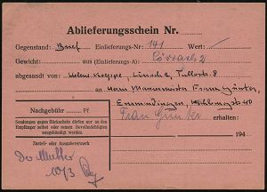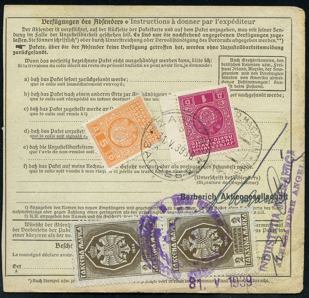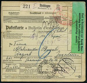 5767 | 25 € | POSTLEITRAUM 7800 (OHNE FREIBURG) : SÄCKINGEN/ Gebühr bezahlt 1939 (20.5.) Doppel-Oval-PFS + schw. Selbstbucher-Paketzettel: Säckingen/ Berberich A.G. + grünes Zoll-Label + Transit-Stpl. VILLACH 2, Ausl.-Selbstbucher-Paket-Kt. n. Zagreb, rs. jugoslaw. Tax- u. Fiskalmarken (Dü.A-5, Nr.20) | ![]() ![]() | |