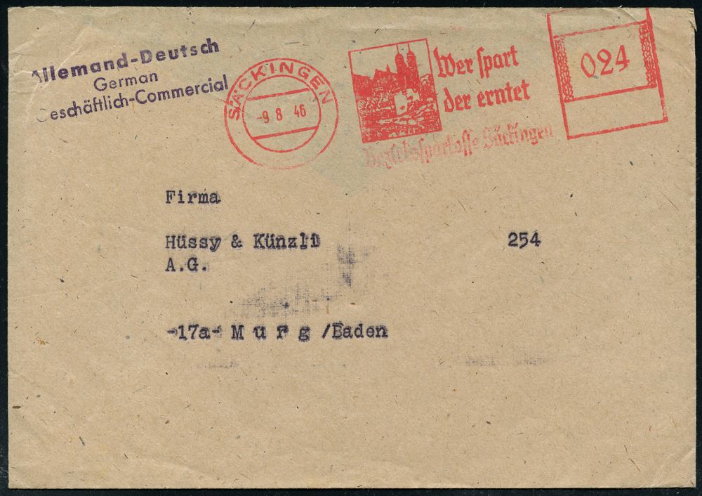 5770 | 22 € | POSTLEITRAUM 7800 (OHNE FREIBURG) : SÄCKINGEN/ Wer spart/ der erntet/ Bezirkssparkasse.. 1946 (9.8.) aptierter AFS Francotyp "Hakenkreuz" = entfernt + Inschrift "Deutsches Reich" (Kirche) rs. fehlt Klappe, Fern-Bf. n. Murg vergl. Kat.-Nr. 5762 (Dü.E-12 AA-98o) | ![]() | |