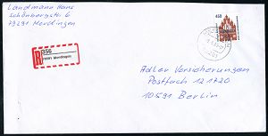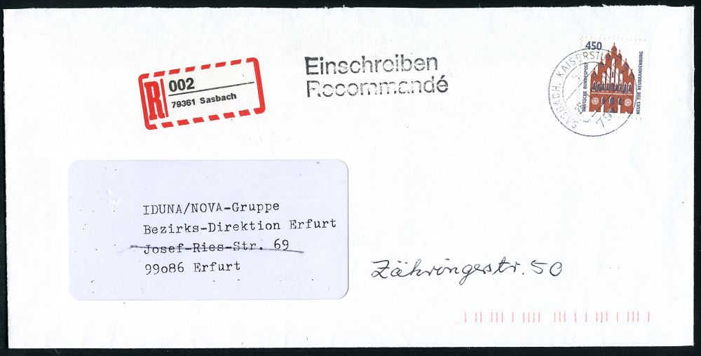 5779 | 10 € | POSTLEITRAUM 7800 (OHNE FREIBURG) : 79361 SASBACH,KAISERSTUHL 1/ b 1995 (26.1.) 1K-Segment auf EF 450 Pf. Neubrandenburg + Selbstklebe-RZ: 79381 , Inl.-R-Bf. (Mi.1623 EF + 10.- EUR)) | ![]() | |