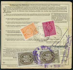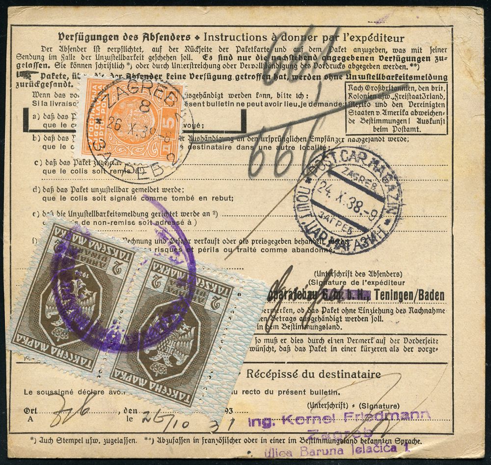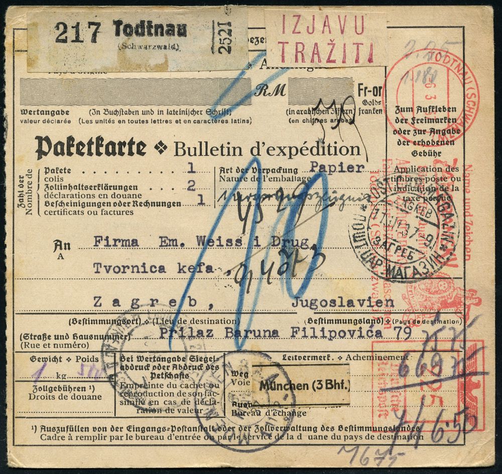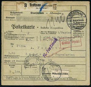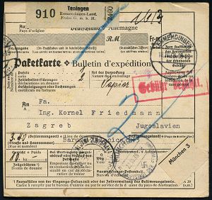 5791 | 28 € | POSTLEITRAUM 7800 (OHNE FREIBURG) : Teningen 1938 (18.10.) schw. Selbstbucher-Paketzettel: Teningen/ Emmendingen-Land./Frako G.m.b.H. + 1K-Brücke: EMMENDINGEN + roter Ra.: Gebühr bezahlt + Leitzettel: München 3, Ausl.-Selbstbucher-Paket-Kt. n. Zagreb, rs. jugoslaw. Tax- u. Fiskalmarken | ![]() ![]() | |
