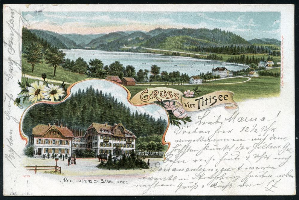5798 | 20 € | POSTLEITRAUM 7800 (OHNE FREIBURG) : TITISEE/ *** 1902 (24.9.) 1K-Gitter auf Color-Litho-Ak.: GRUSS vom Titisee mit Hotel u. Pension Bären (u. Landschaft) Bedarfs-Kt. n. Ffm.-Sachsenhausen, AS. | ![]() ![]() | |
