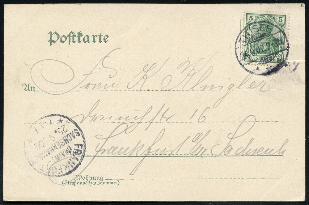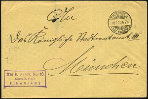 5794 | 12 € | POSTLEITRAUM 7800 (OHNE FREIBURG) : THIENGEN/ *(AMT WALDSHUT)* 1900 (10.2.) 1K-Gitter + viol. Ra.3: frei lt. Avers No. 16/GROSSH. BAD./FINANZAMT u.a. rs., Fern-Diennst-Bf. n. München | ![]() ![]() | |
