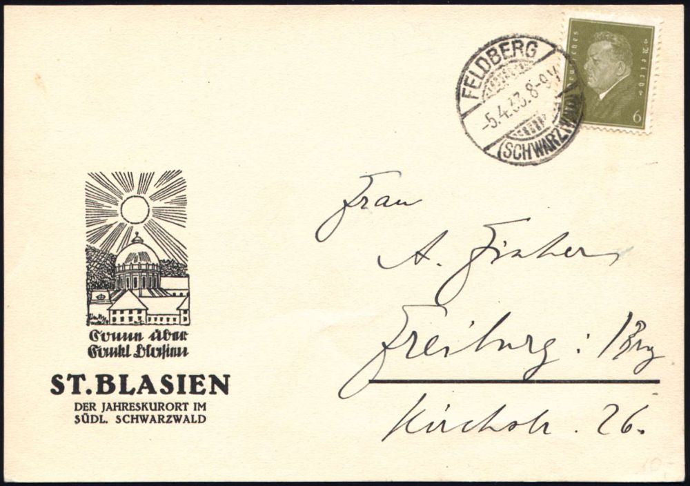 5681 | 16 € | POSTLEITRAUM 7800 (OHNE FREIBURG) : FELDBERG/ (SCHWARZWALD) 1933 (5.4.) 1K-Gitter = Hauspostamt Hotel Feldberg auf s/w.-Reklame-Kt.: ST. BLASIEN DER JAHRESKURORT.. (Kurhaus, Sonne) Bedarf (Mi.465) | ![]() | |