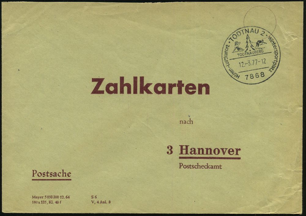 5811 | 14 € | POSTLEITRAUM 7800 (OHNE FREIBURG) : 7868 TODTNAU 2/ TODTNAUBERG/ Wintersportplatz 1977 (12.3.) HWSt = Skiläufer (Sonnenbadende, Tanne) klar a. PSch-Innendienst-Bf. "Zahlkarten nach 3 Hannover Postscheckamt" (grün/braun für Zahlkartenaustausch, seltene Verwendung! | ![]() | |