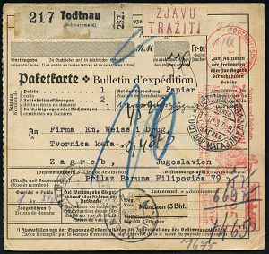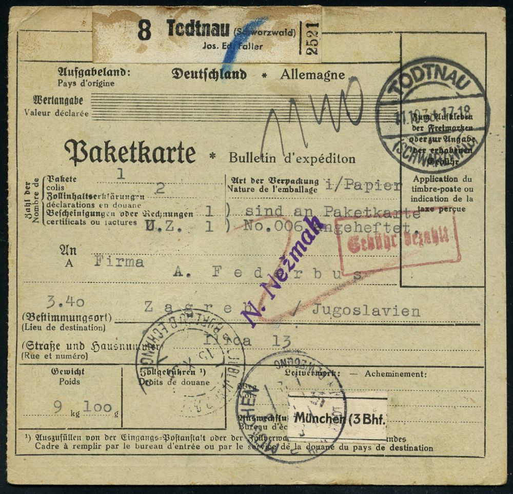5808 | 25 € | POSTLEITRAUM 7800 (OHNE FREIBURG) : TODTNAU/ (SCHWARZWALD) 1938 (11.10.) 1K-Brücke + viol. Ra.: Gebühr bezahlt + schw. Paketzettel: Todtnau (Schwarzwald)/ Jos. Ed. Faller (natürliche Leimspuren) + Transit-Label: München (3 Bhf.), Ausl.-Selbstbucher-Paket-Kt. = Bürstenfabrik n. Zagreb, rs. jugoslaw. Tax- u. Fiskalmarken | ![]() ![]() | |
