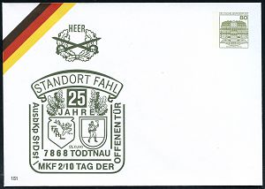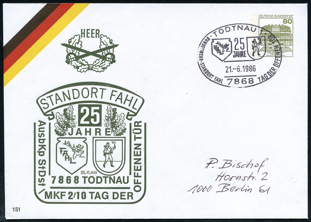 5813 | 10 € | POSTLEITRAUM 7800 (OHNE FREIBURG) : 7868 TODTNAU 1/ 25 JAHRE/ BUNDESWEHR-STANDORT FAHL.. 1986 (21.6.) SSt (Wappen) auf motivgl. PU 80 Pf. Burgen, oliv: STANDORT FAHL, 25 JAHRE.. (Mi.PU 117) | ![]() | |