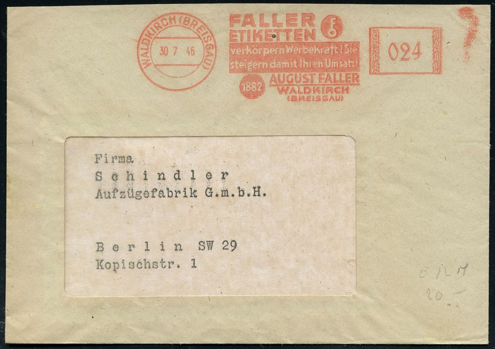 5817 | 25 € | POSTLEITRAUM 7800 (OHNE FREIBURG) : WALDKIRCH (BREISGAU)/ FALLER/ ETIKETTENVerkörpern Werbekraft../ AUGUST FALLER.. 1946 (30.7.) aptierter AFS Francotyp "Hakenkreuz" = entfernt + Inschrift "Deutsches Reich" , klar gest. Fern-Bf. (Dü.E-12 AE-98o = seltene Type) | ![]() | |