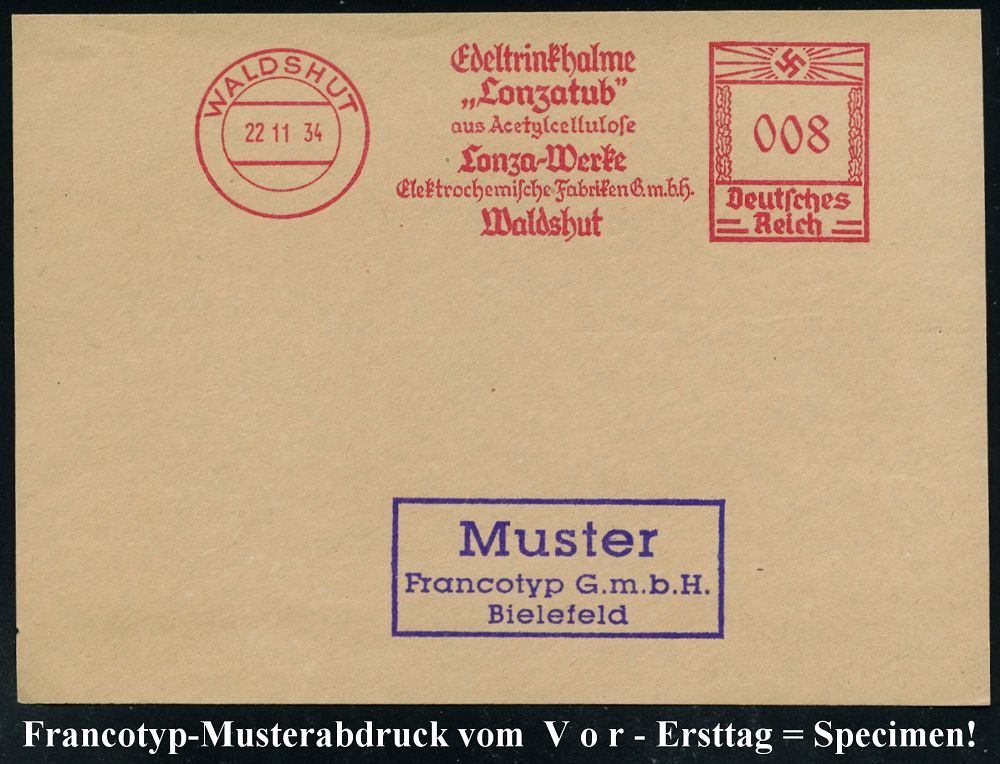 5820 | 35 € | POSTLEITRAUM 7800 (OHNE FREIBURG) : WALDSHUT/ Edeltrinkhalme/ "Lanzatub"/ aus Acetylcellullose/ Lonza-Werke/ Elektrotechn.Fabriken.. 1934 (22.11.) AFS-Musterabdruck Francotyp "Hakenkreuz" , glasklar gest. Francotyp-Musterblatt vom V o r - Ersttag ! (mit Attest), selten! (Dü.E-3CEo) | ![]() ![]() | |