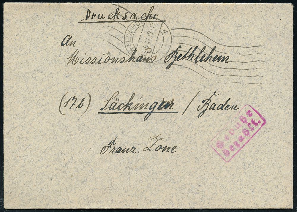 5823 | 12 € | POSTLEITRAUM 7800 (OHNE FREIBURG) : WALDSHUT/ d 1947 (13.5.) schw. RollWellSt. + viol. Ra.2: Gebühr/ bezahlt. , Inl.-Drs.-Bf. | ![]() | |