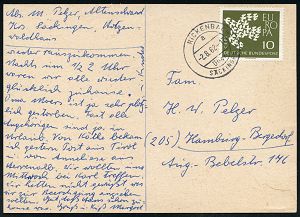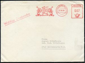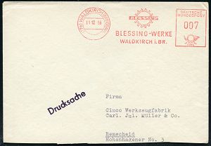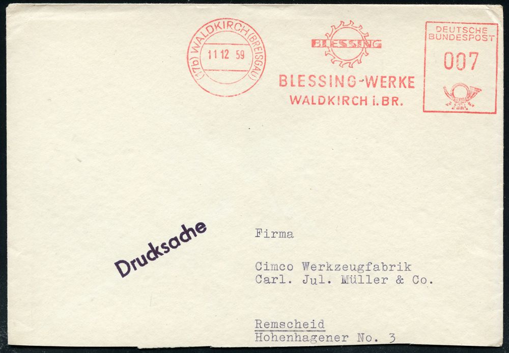 5826 | 10 € | POSTLEITRAUM 7800 (OHNE FREIBURG) : (17b) WALDKIRCH (BREISGAU)/ BLESSING-WERKE.. 1959 (11.12.) AFS Francotyp (Zahnrad-Logo) unten verkürzter Inl.-Drs.-Bf. (Dü.E-23CO) | ![]() | |
